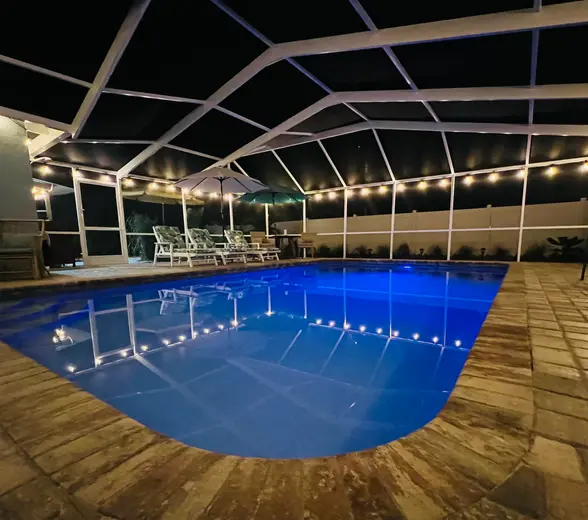 Step into our screened lanai and feel the embrace of tropical luxury. The gleaming heated saltwater pool, that we can adjust to your preferred temperature, waits patiently for your first dip. This outdoor retreat also includes dining and lounging areas, perfect for morning coffees, alfresco meals, or evening cocktails.
